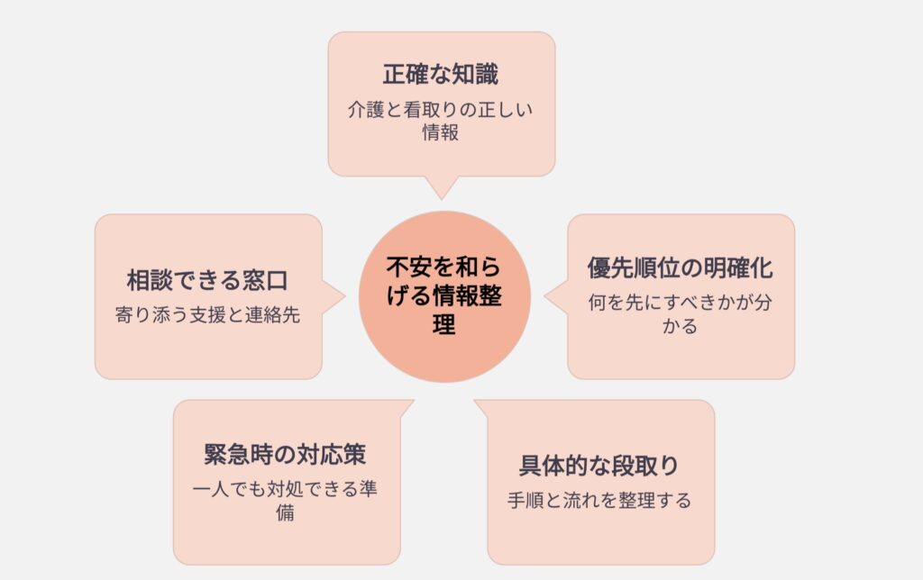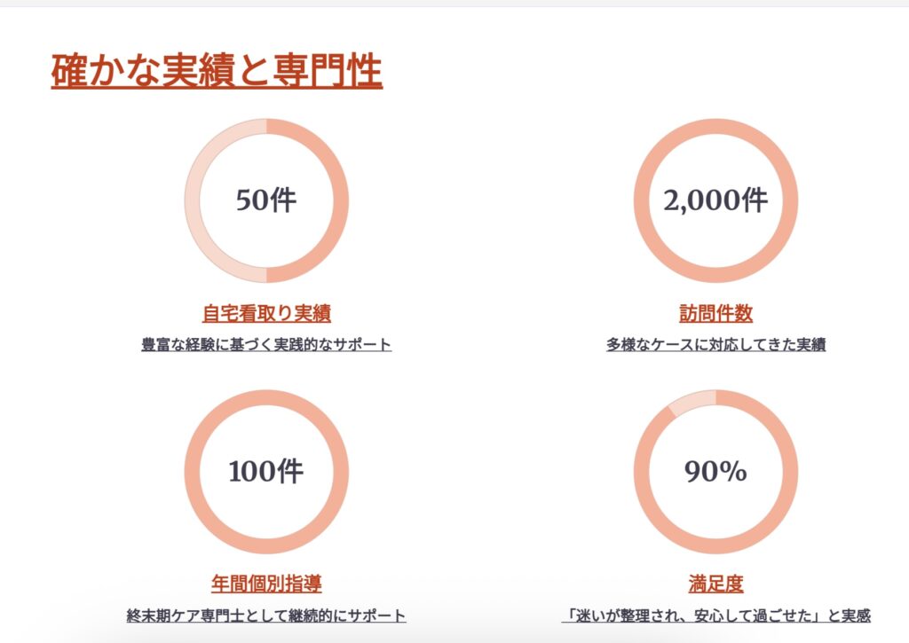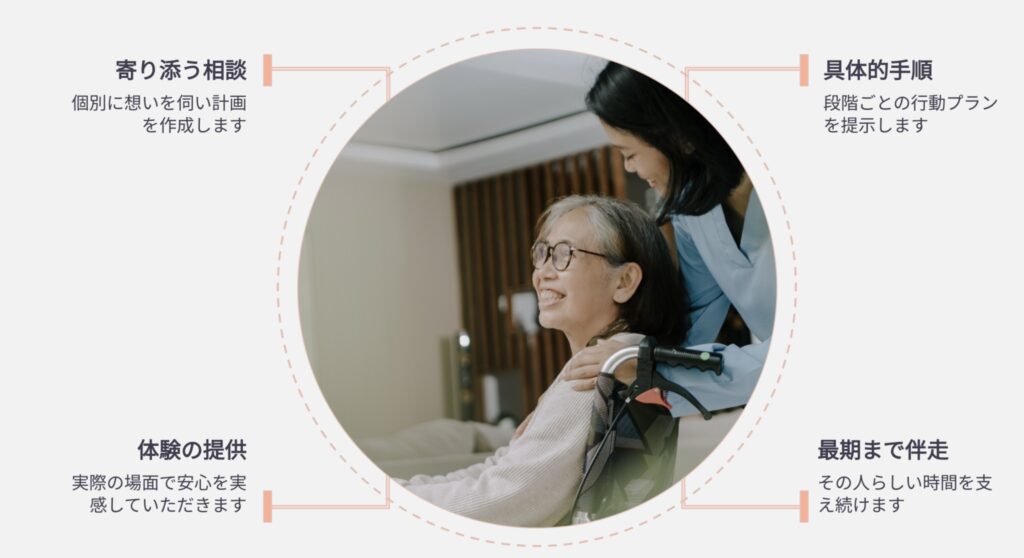 今すぐ相談する 病院や訪問看護では断片的な情報しか得られず、それぞれの家庭に合う判断の道筋は示されないまま、一人で迷いと不安を背負ってしまう方が多い。 また、私自身も母を看取った経験から、“情報や優先順位が整理されていないこと”による不安を痛いほど理解しています。 そんな多くの声を、ご家族からこれまで聞いてきました。介護や看取りで迷うのは、正しい情報や段取りを教えてくれる人がそばにいないから。 相談しても納得できなかった…そんな孤独を抱えていませんか? だからこそ生まれたのが、納得感を持ちながら最期まで"その人らしい時間“を過ごせる伴走サポートです。ここでしか得られない具体的な手順と体験を通して、安心を手に入れましょう。 最期まで"その人らしい時間"を整える 専門家と一緒に優先順位を整理し、介護・看取りの迷いを減らせます。 家族の心の負担を軽くする 心理的サポート付きで、疲れや罪悪感を減らし、すぐに自信を持って向き合えます。 最適なケアの判断力が身につく 訪問看護師としての経験豊富な知識と終末期ケア専門士の視点で、”やるべきこと・優先すべきこと”を整理できます。 家族との関係も円滑に 具体的な言葉かけや介助方法が学べ、本人も家族も安心できる時間を増やせます。 あなたが手に入れられる4つの成果 ⒈ 体調と生活環境を専門家がチェックオンラインでも姿勢・動作・生活動線を確認し、今の状況に合ったケアを見立てます。 ⒉ “今すぐやるべきこと”が分かる介護・医療・生活の優先順位を整理し、すぐ行動に移せます。 ⒊ 迷いが減り、判断に自信が持てる「これでいい」と思える具体的な答えが得られます。 オンライン看護診断で得られる3つの安心 こんな方にオススメ 親の介護や看取りで「何を優先すべきか分からない」と悩んでいる方 一人で抱え込むのが不安で、信頼できる専門家に相談したい方 心の負担を減らし、安心して日々を過ごしたい方 専門家の視点で具体的な段取りや判断基準を知りたい方 家族全員が納得できる在宅ケア方法を整理したい方 終末期ケア専門士の資格 専門的な知識と技術で、サポートします。 独自のアプローチ わかりやい言葉✖️内なる意識を表出し、心の整理までサポート! 実践的なノウハウをご伝授 相談後、すぐに実践できる、迷わず行動できる具体的なノウハウをお伝えします。 相談者の声 Aさん(70代女性)「相談で段取りが整理でき、不安が減り、最期まで悔いのない時間が過ごせました。」 Bさん(60代男性)「母の看取りが心配でしたが、今後の流れを教えて下さり、安心できました。そして、大切に扱われたと本人も実感していました」 Cさん(70代女性)「一家に一台欲しい」 多くの方が実感専門的なサポートにより、不安や迷いが解決され、家族みんなが安心して過ごせるようになっています。 オンラインで相談できますか?全国どこからでも、Zoomや電話で対応可能です。お住まいの地域に関係なく、専門的なサポートを受けていただけます。 介護経験がなくても大丈夫ですか?初めての方でも段階を踏んで丁寧にサポートします。基本的なことから分かりやすく説明いたします。 相談後すぐに実践できますか?具体的なチェックリストや手順付きで、すぐに活用できます。実践的なノウハウをお持ち帰りいただけます。 家族全員で参加できますか?可能です。複数名参加用の特典資料もご用意しています。家族みんなで情報を共有できます。 よくある質問 おうちケア相談室1回60分/オンラインオンライン看護診断つきケア整理シート付きフォロー相談(メール1回) 相談内容現状の課題整理優先順位の明確化具体的な行動計画 料金 モニター募集中 先着10組限定 無料 初回限定特典相談内容を整理できるオリジナル「ケア整理シート」プレゼント緊急時対応マニュアルのPDF亡くなる過程の「6つのフェーズ」のPDF フォロー相談初回から1週間以内にメール相談1回無料 専門家による完全個別対応1対1で、あなたの話を最後まで丁寧に伺います オンライン対応自宅から参加可能 最期まで"その人らしい時間"を守る伴走サポートをぜひ体験してください‼️ 一歩踏み出すだけで、家族も本人も安心して過ごせる時間が増えます。あなたの不安や迷いに寄り添い、専門的な知識と経験で納得と安心のサポートをお約束します。👉 今すぐ『おうちケア相談室』にお申し込みください。 今すぐ相談する